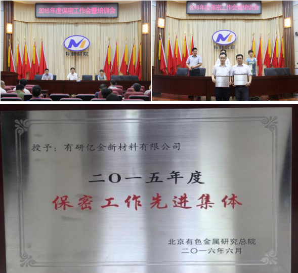 7月5日上午,北京有色金属研究总院召开了“2016年保密工作会议暨培训会”,并颁发了2015年度保密工作先进集体奖和先进个人奖,乐鱼网页版登录入口,乐鱼(中国)喜获“2015年度保密工作先进集体”荣誉称号。有研总院黄松涛副院长、科技开发部常秀敏主任、朱宝宏副主任、各二级单位和控股公司的全体保密人员参加了大会。