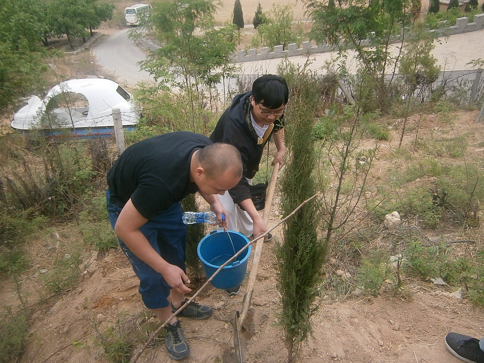 活动请植树基地的安师傅为我们讲解了植树流程以及注意事项,并给每人发放了水桶、铁锹等工具,之后便3人一组的开始了。过程虽然有些累,但是大家积极踊跃,充满了热情。你扶树苗,我铲土,很快一棵棵树苗站立了起来。当时大家都非常的兴奋,对于部分青年这是人生中的第一次植树。